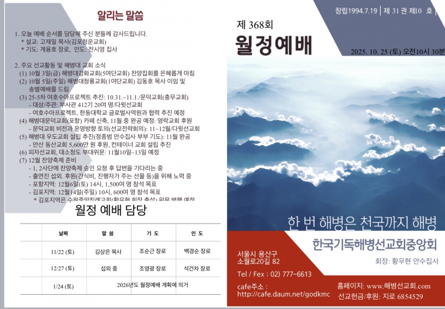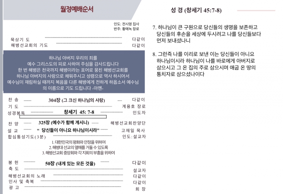 - 찬양: 해병선교회찬양단(지휘: 김원하 목사)