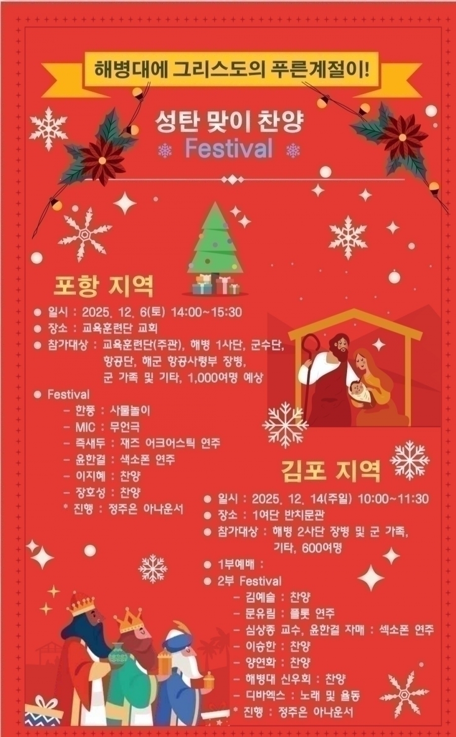 ![]() ![]() 2025년 성탄을 맞이하여 감사 찬양 Festival을 은혜가 충만한 가운데 마쳤습니다. 12.6일 토요일 오후 포항 교육훈련단 교회에서 장병700여명이 참석하였고 12.14일 주일 오전 김포 2사단 1여단 반치문관에서 500여명이 참석하였습니다. 장병들이 은혜받고 사기를 고양하는 귀한시간이었습니다. 해병대중앙교회, 해군중앙교회, 수원 중앙침례교회, 포항 오천교회, 해군해병대 장로회, 손원일선교센터에서 후원해 주셨습니다 선교회중앙회는 매년 12월에 Festival을 시행하여 한 명의 해병이라도 더 영혼구원하기 위한 헌신을 계속할 것입니다. 기도와 동참, 후원을 부탁드립니다 |